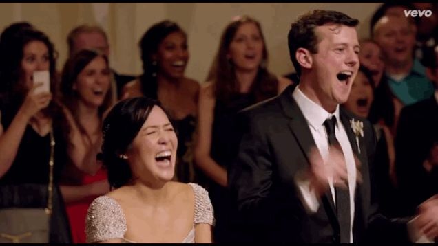 Now, to the reasonable newlywed, this might seem like a nightmare or, at the very least, perfectly reasonable grounds to cut ties with whoever allowed this debacle to occur. Not so for the brides and grooms of the video, however. They're thrilled to have Maroon 5 ruin their wedding. Especially, this guy: