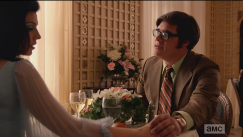 Good god, though: of all the sad shit in this episode, hands down the most horrific was the interchange between Megan and Harry Crane, whose dalliance in showbiz has liberated him to become the classic Hollywood asshole, thinking his proximity to agents can bag him a babe like Megan. "You're a big girl," he tells her, and implies that she is without leading roles because of her unwillingness to sleep with disgusting fuckballs like Harry Crane; she is repulsed, of course, and unfortunately does not throw her wine in his face. At least she left him with a big check.
