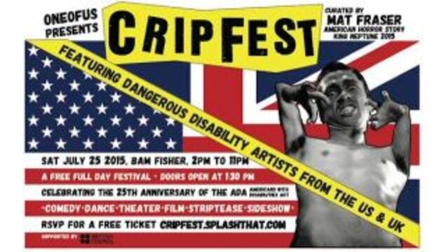 I’d only heard about Cripfest a few days before, but had felt compelled to attend, not least because it had been organized by ONEOFUS, a radical production company run by American Horror Story: Freakshow’s Mat Fraser and artist Julie Atlas Muz. Billed as a celebration of the 25th anniversary of the landmark Americans with Disabilities Act (ADA), Cripfest brought together British and American activists, comedians, actors, dancers, musicians, and burlesque performers from across the disabled community for an all-day program of art, laughter, and solidarity (and nudity, lots of nudity!). As Fraser explained in a statement on the Cripfest website,